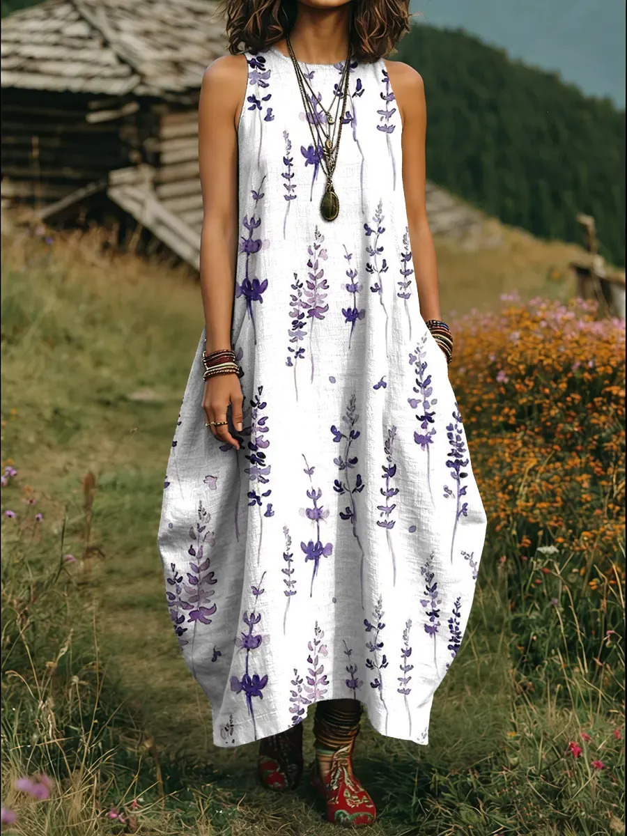 Women's Floral Art Print Round Neck Sleeveless Cotton Pocket Dress