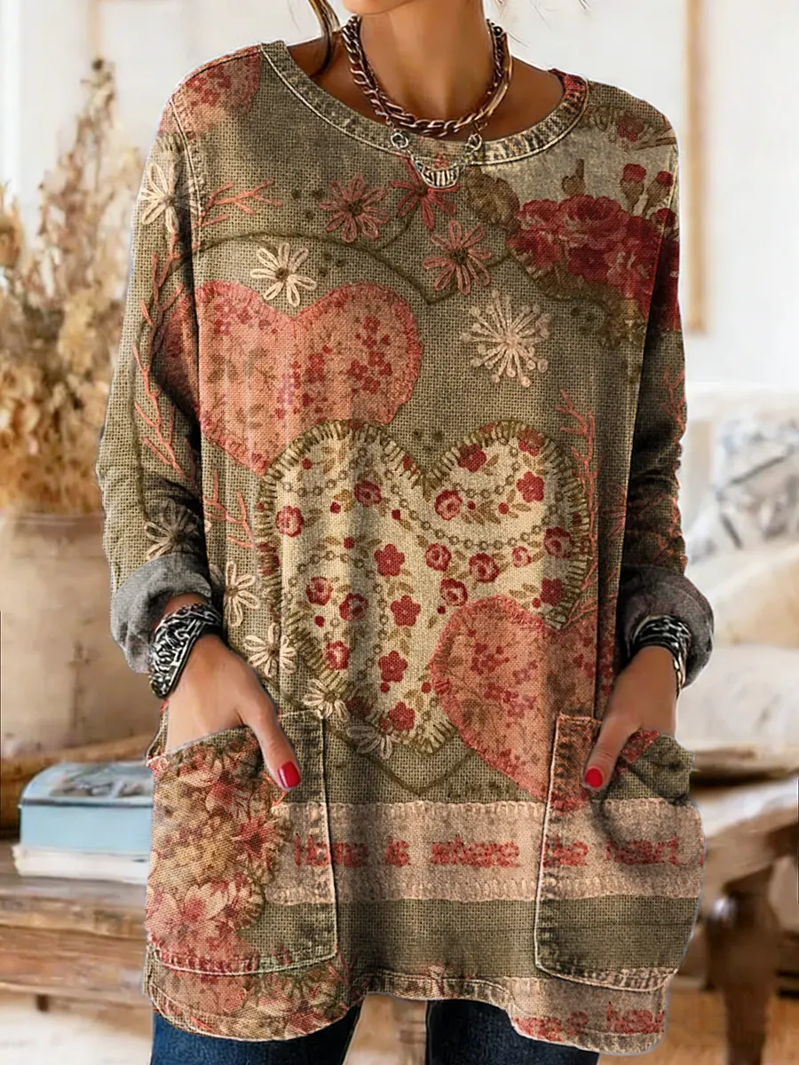 Women's Floral Heart Pattern Art Print Casual Long-sleeve Crew Neck Pocket Cotton Denim T-shirt