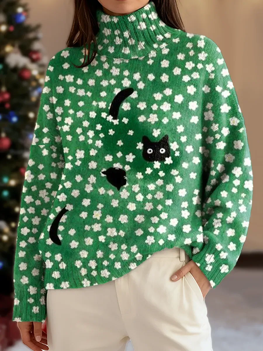 Women's Funny Cat Art Print Knit Turtleneck Pullover Sweater