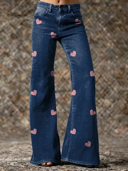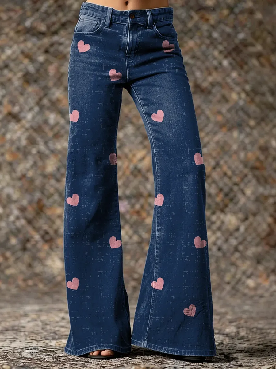 Women's Heart-pattern Art Print Washed Denim Jeans