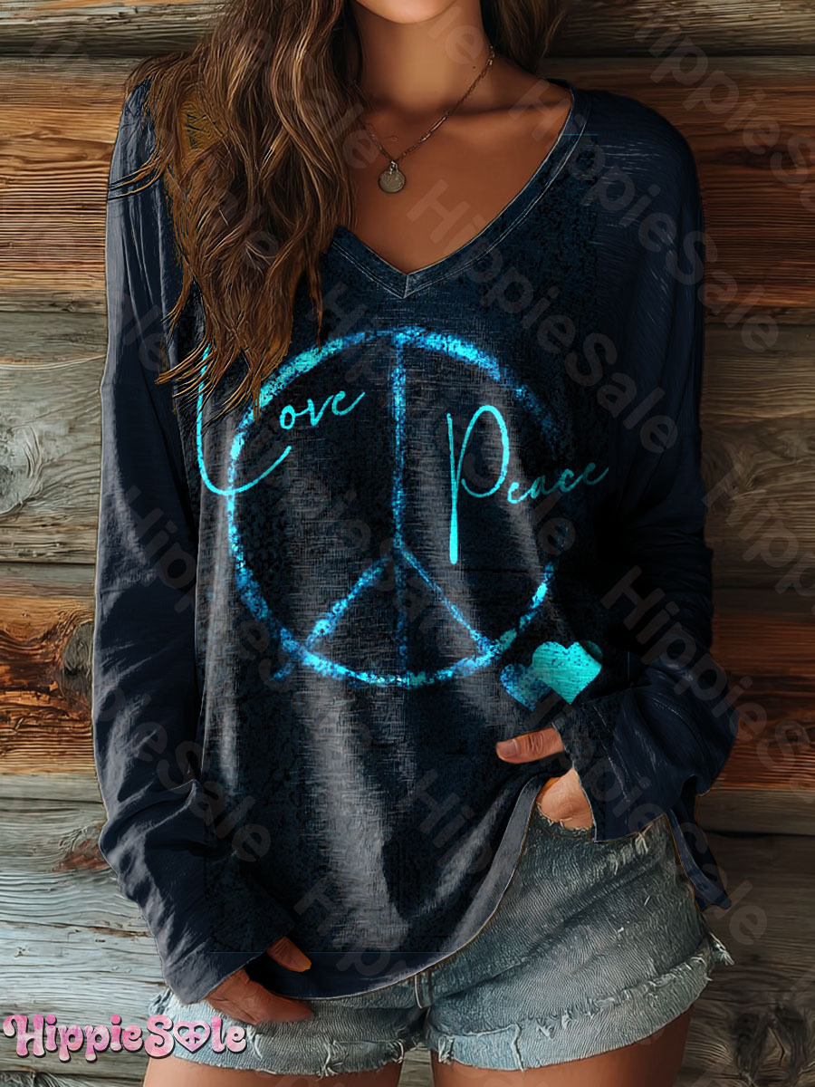 Women's Love Peace Hippie Sign Print Casual V-neck Long Sleeve T-shirt