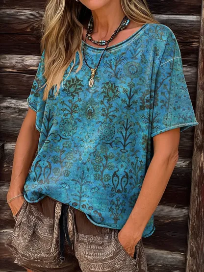 Women's Retro Ethnic Totem Art Print Casual Short-Sleeve Round Neck Cotton T-Shirt