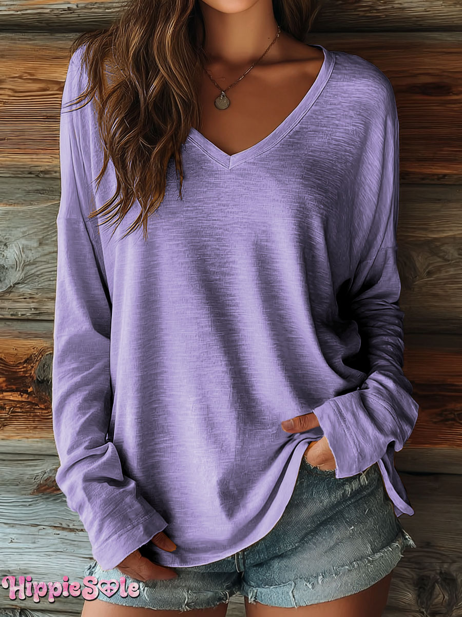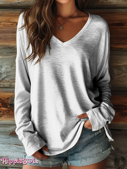 Women's Solid Color V-neck Long Sleeve Casual Cotton T-shirt
