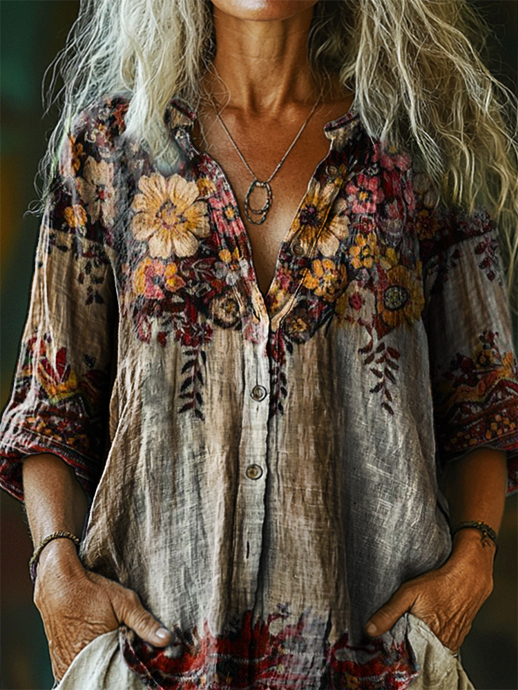 Women's Vintage Ethnic Floral Art Print Casual Cotton Linen Shirt