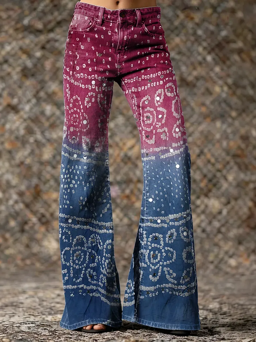 Women's Vintage Ethnic Pattern Art Print Washed Denim Jeans