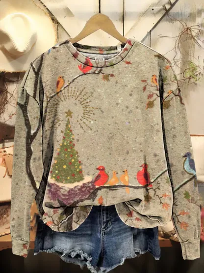 Christmas Tree Bird Print Casual Sweatshirt