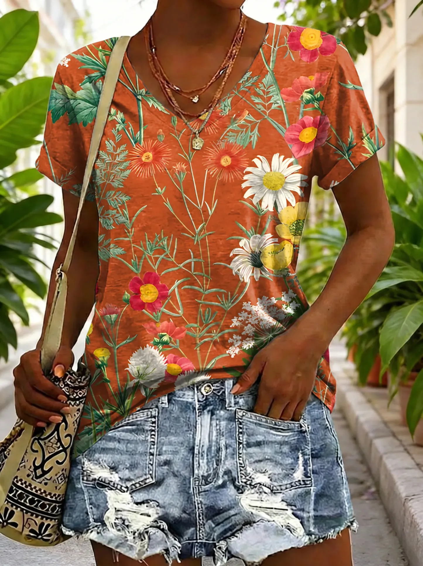 Ethnicity Flowers Orange Women's V-neck Print Casual T-shirt