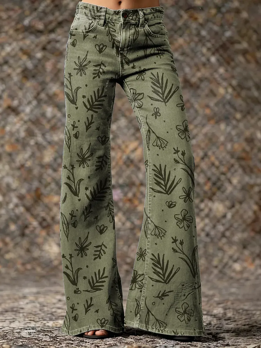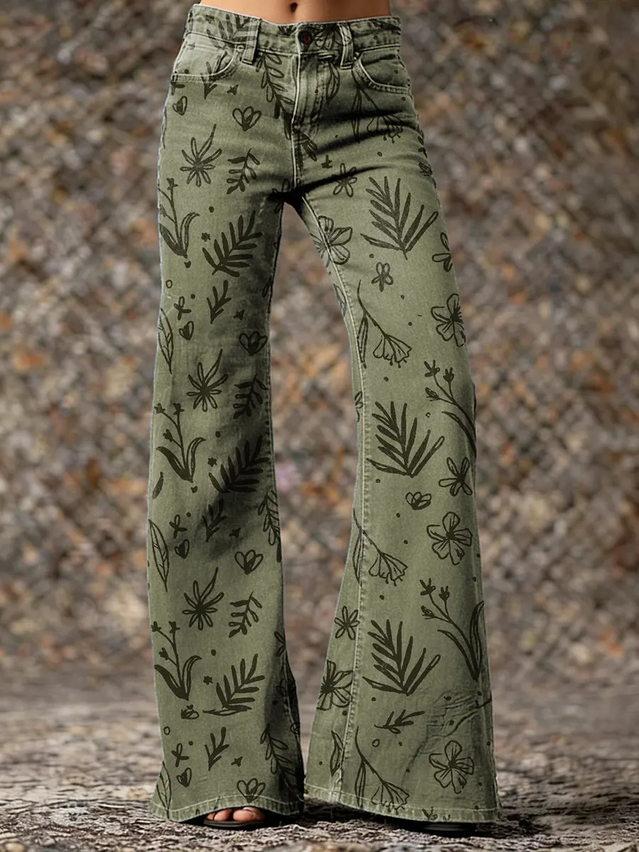 Ethnicity Green Flowers Women's Print Casual Wide Leg Pants