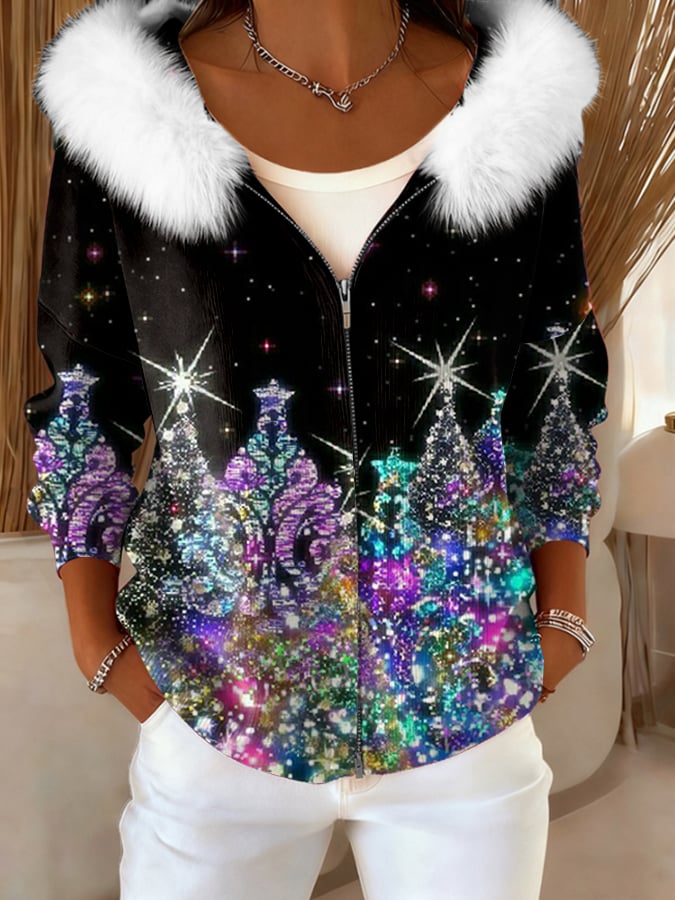 Women's Christmas Tree Print Fur Collar Zipper Casual Hooded Sweatshirt