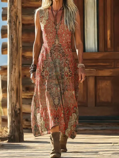 Women's Ethnic Totem Art Print Sleeveless Pocket Cotton Dress