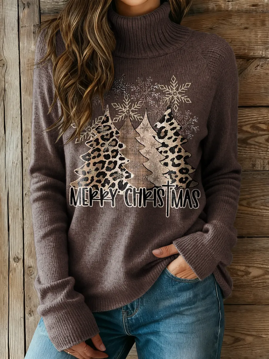 Women's Merry Christmas Leopard Print Turtleneck Sweater