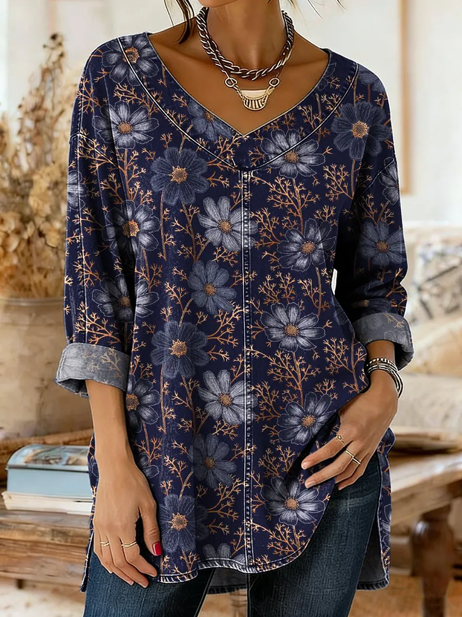 Women's Vintage Ethnic Blue Floral Art Print Casual V-neck Long Sleeve Washed Denim Shirt