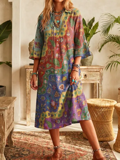 Women's Vintage Ethnic Collage Floral Art Prints Casual Lapel Buttons Shirt Dresses