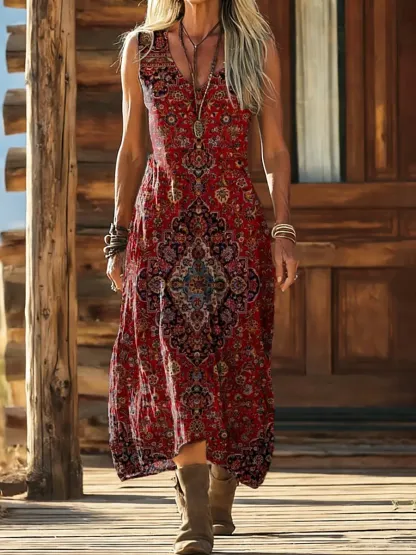 Women's Vintage Ethnic Floral Art Print V-neck Sleeveless Cotton Dress With Pockets