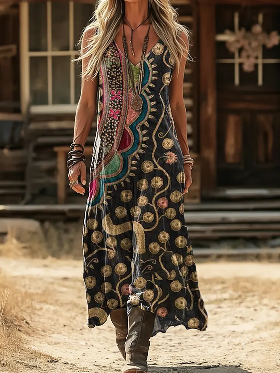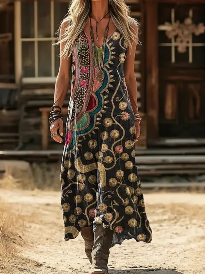 Women's Vintage Ethnic Floral Print Artistic Sleeveless V-neck Dress With Pockets