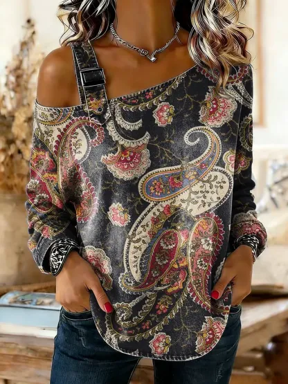 Women's Vintage Floral Print Artistic Long-sleeve Tank Top In Washed Cotton Denim