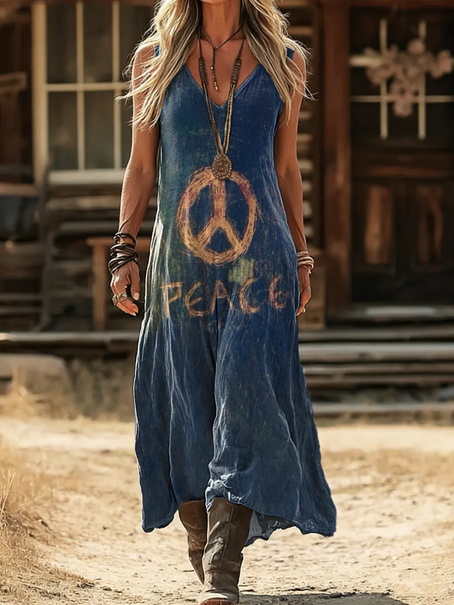 Women's Vintage Hippie Art Print V-neck Sleeveless Cotton Dress With Pockets
