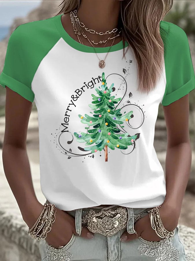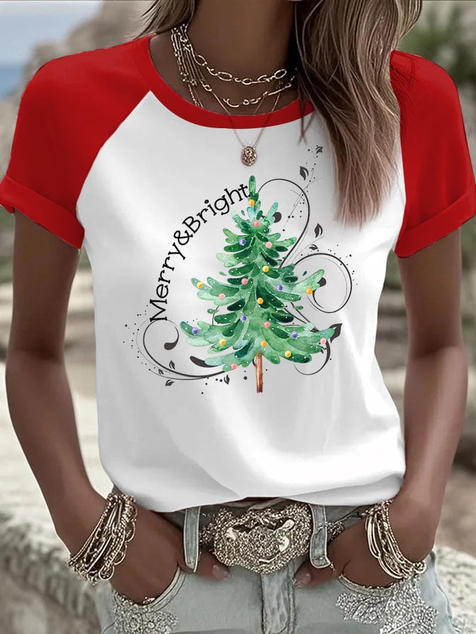 Women'S Merry and Bright Christmas Tree Print T-Shirt
