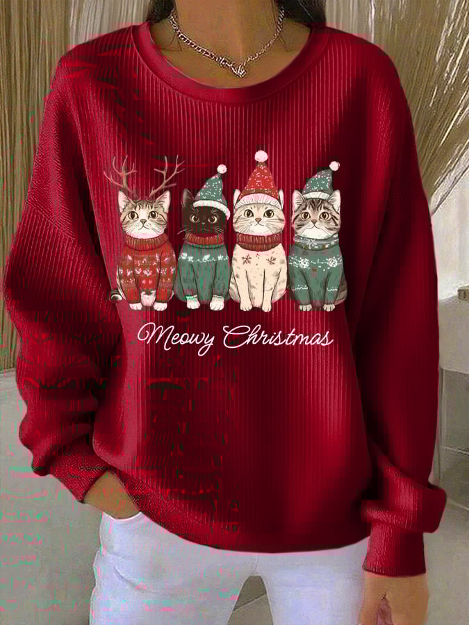 Women's Christmas Cat Lover Print Knitted Crew Neck Long Sleeve Top