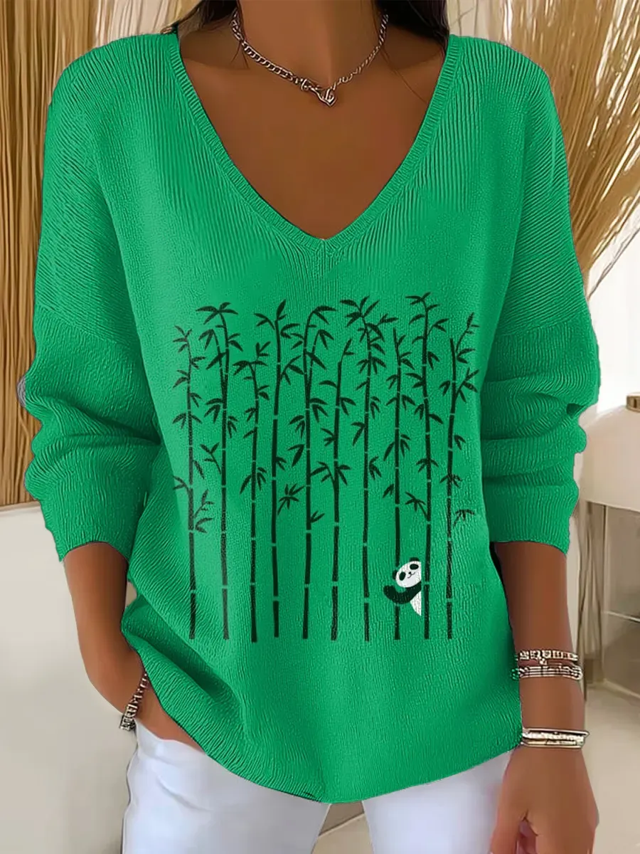 Cute Panda Vintage Art Print Casual V-neck Pullover Sweater