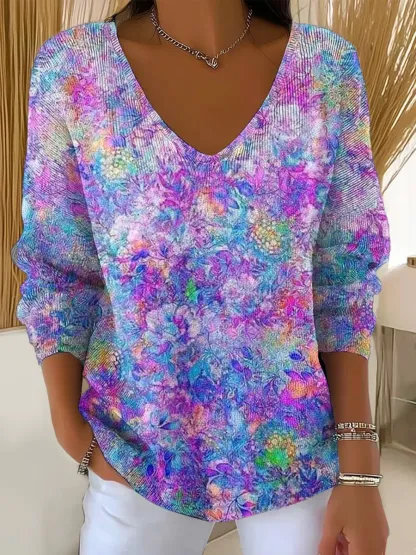 Purple Vintage Art Print Casual V-neck Pullover Sweater