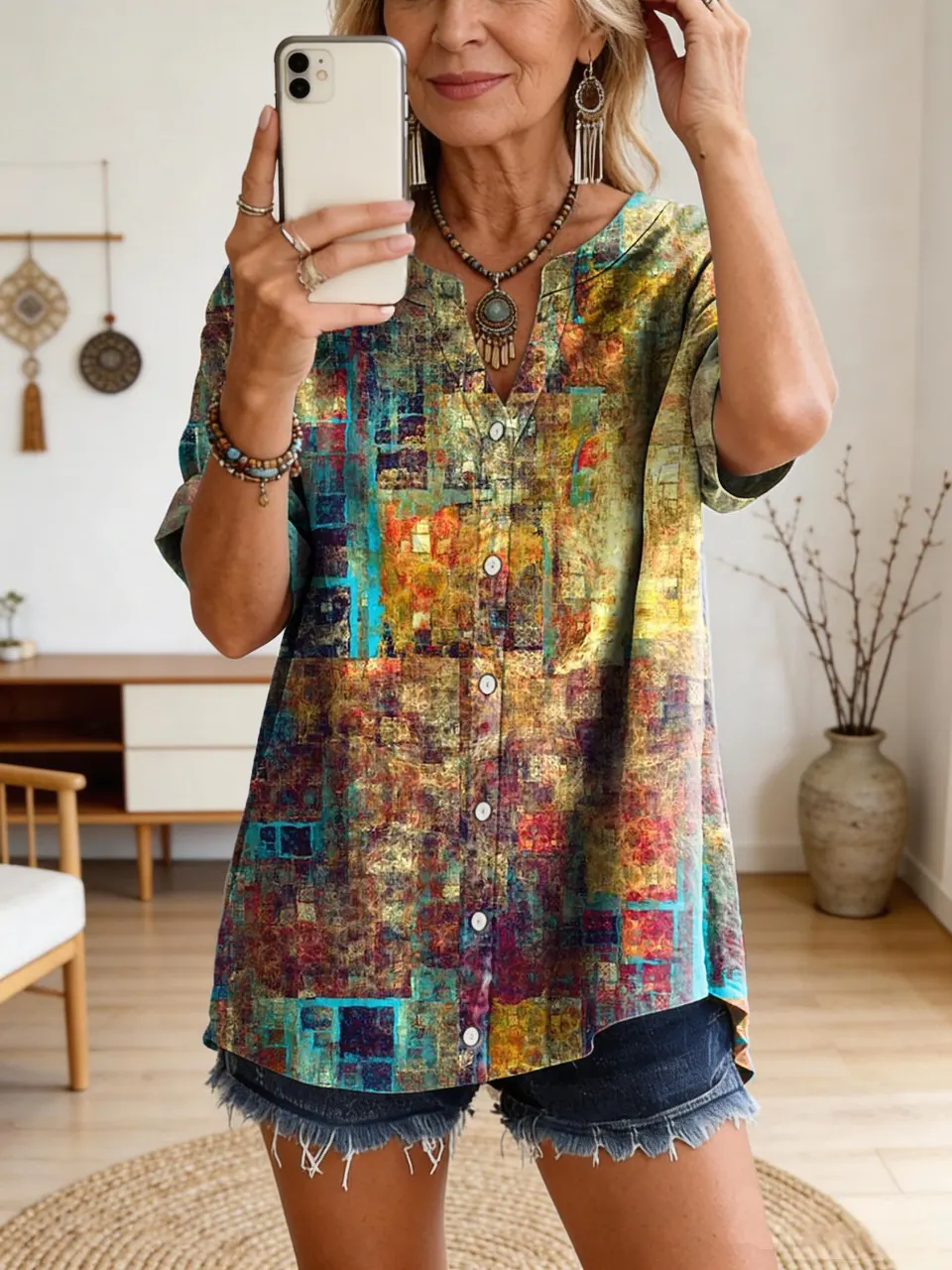 Women's Bohemian-Style Artistic Print Cotton-Linen Casual Top