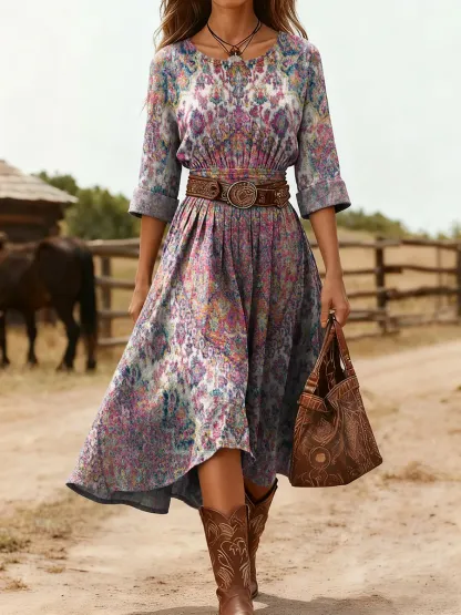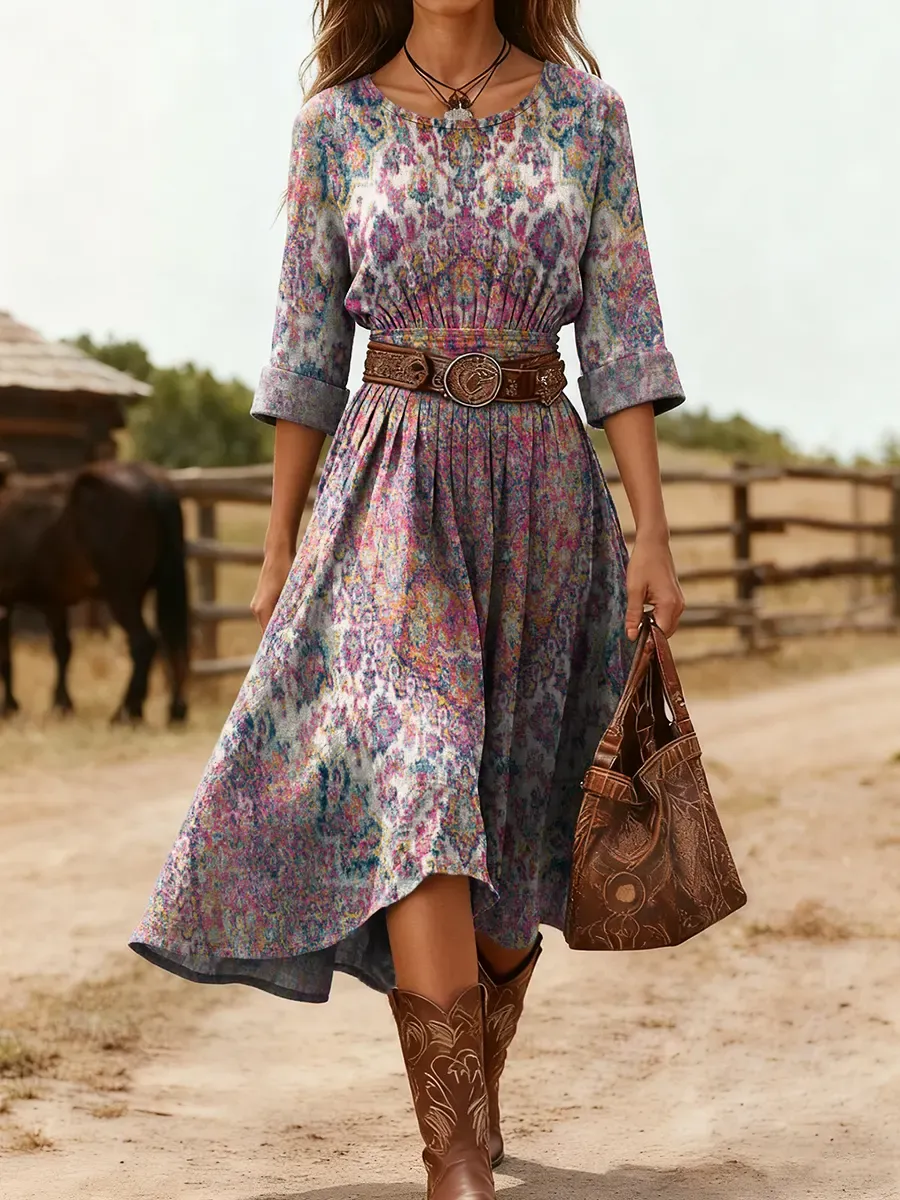 Women's Ethnic Totem Art Pattern Prints Round Neck Cotton Linen Pocket Dress
