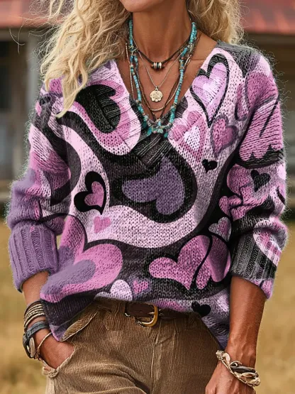 Women's Heart-pattern Art Print V-neck Sweater