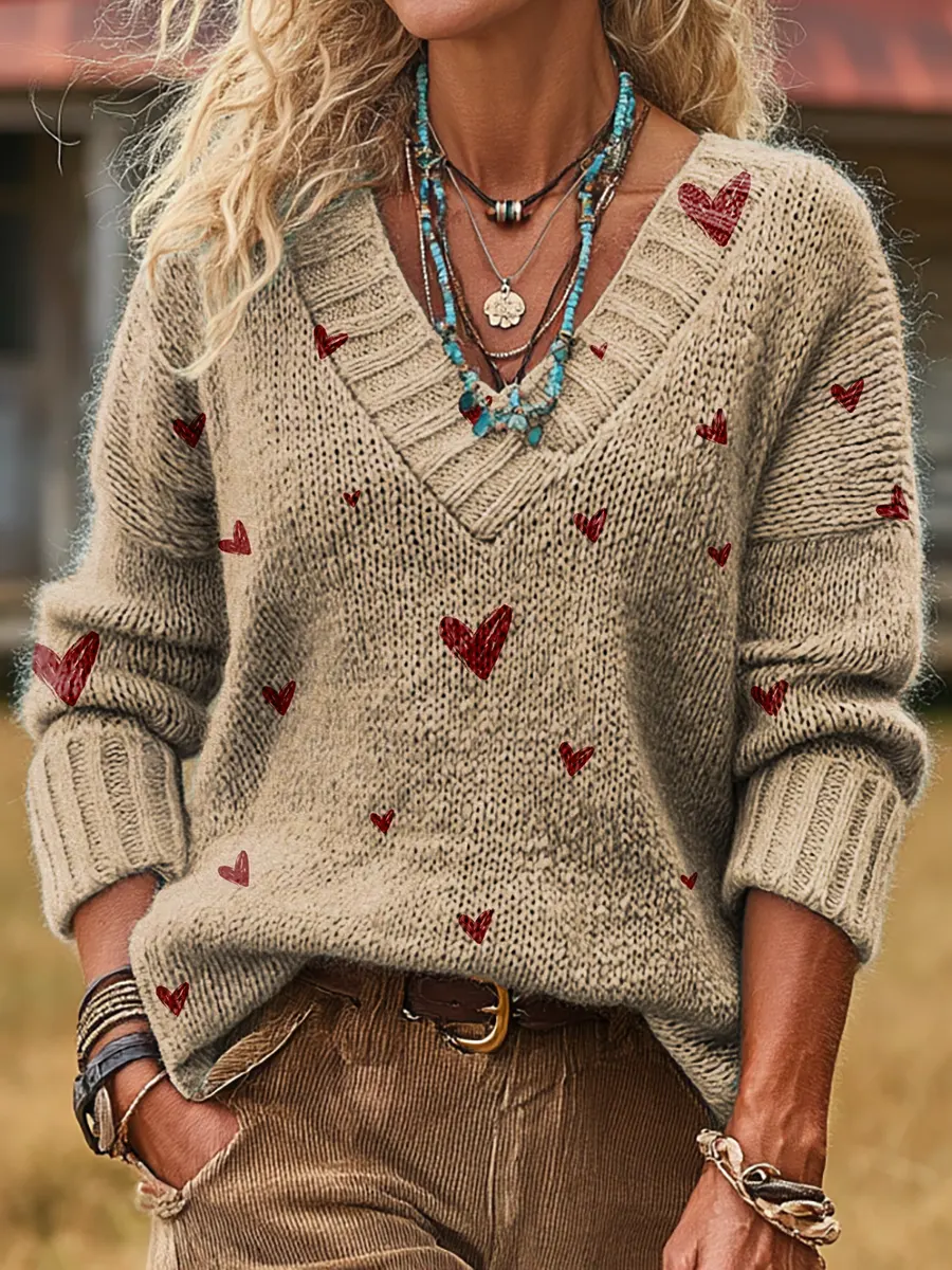 Women's Heart-pattern Art Print V-neck Sweater