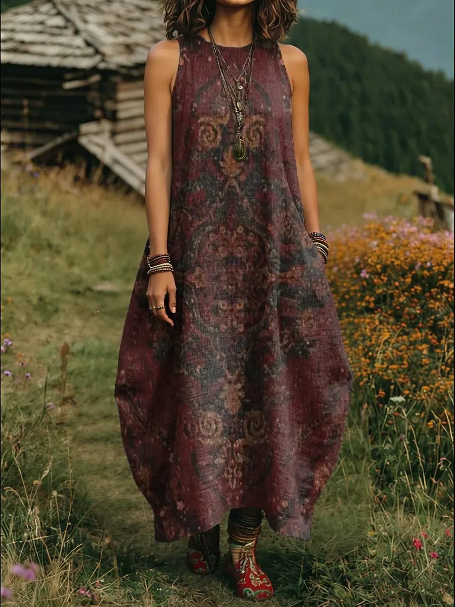 Women's National Totem Art Print Round Neck Sleeveless Cotton Pocket Dress