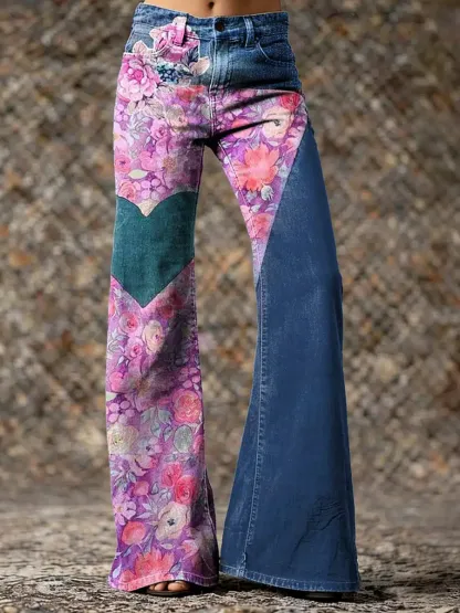 Women's Pink Heart-patterned Patchwork Art Print Casual Washed Cotton Denim Jeans
