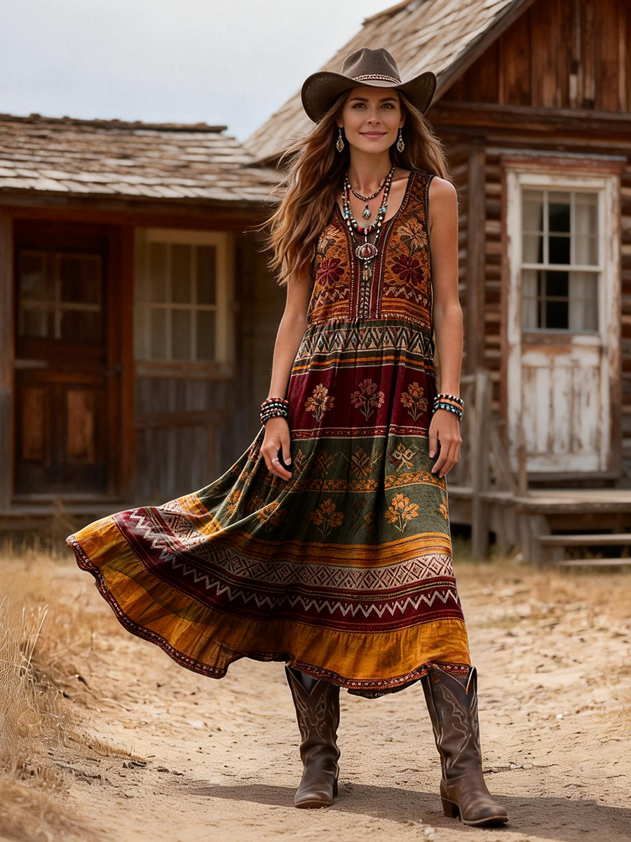 Women's Retro Ethnic Floral Art Print Casual Sleeveless Round Neck Cotton Dress
