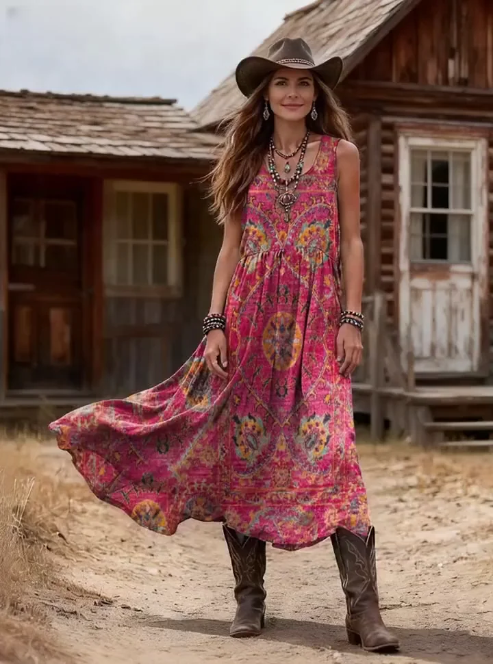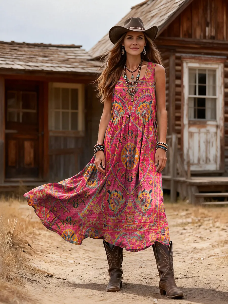 Women's Retro Ethnic Totem Art Print Casual Sleeveless Round Neck Cotton Dress