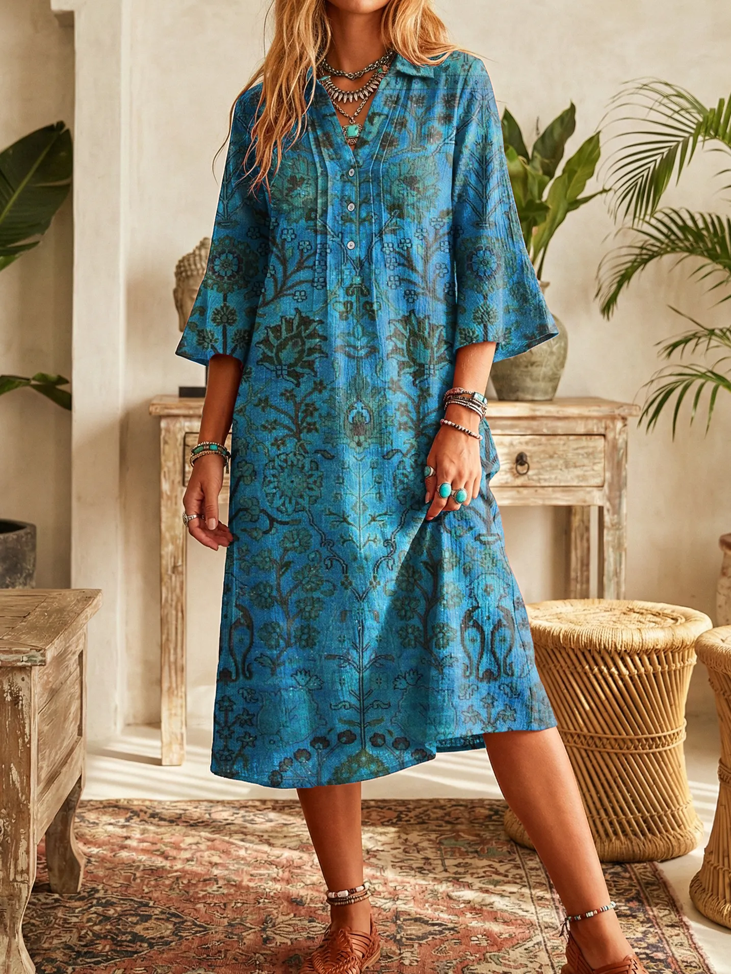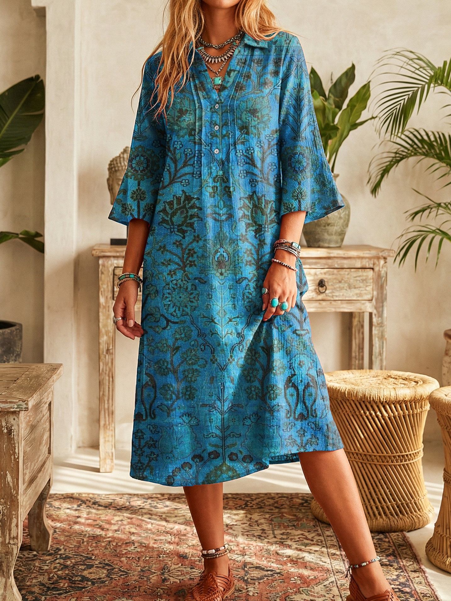 Women's Vintage Ethnic Blue Floral Totem Art Printed Casual Lapel Ruffles Button Dresses