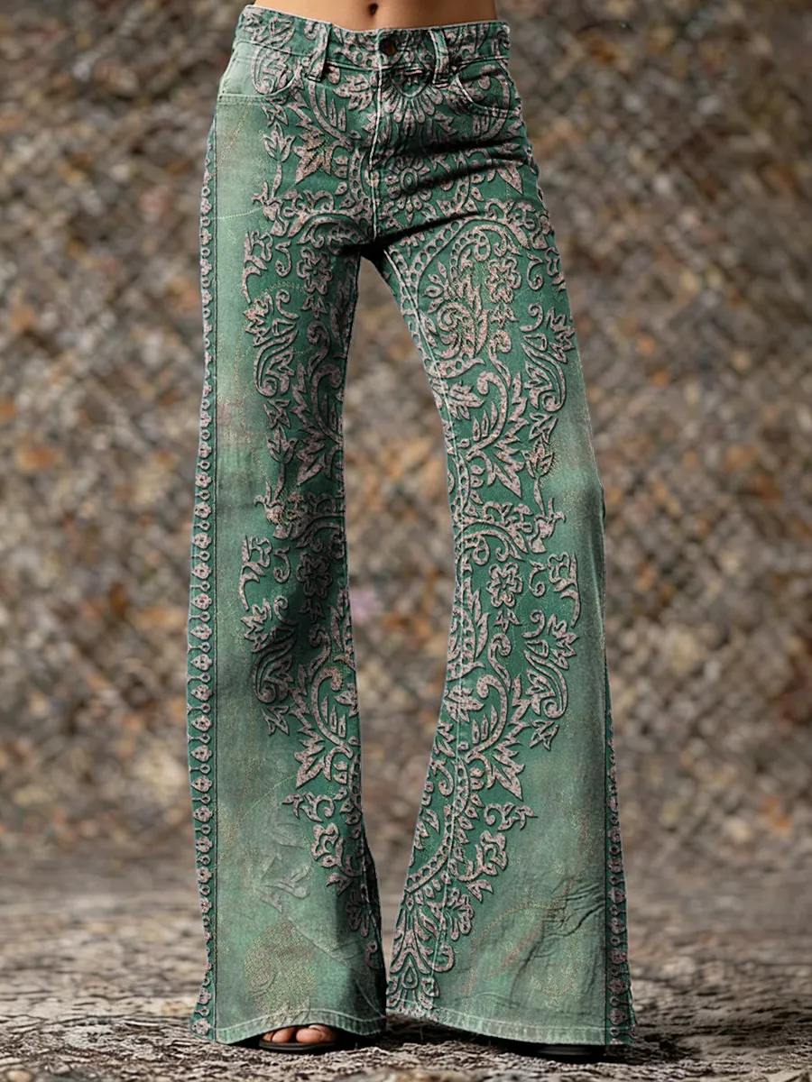 Women's Vintage Ethnic Green Totem Art Prints Casual Denim Flare Pants