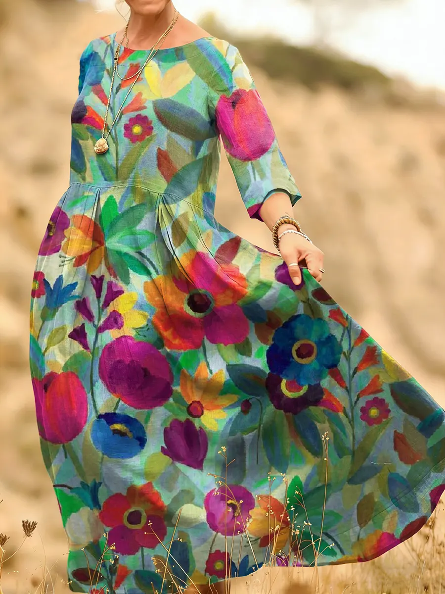 Women's Watercolor Floral Art Print Round Neck Cotton Linen Pocket Dress