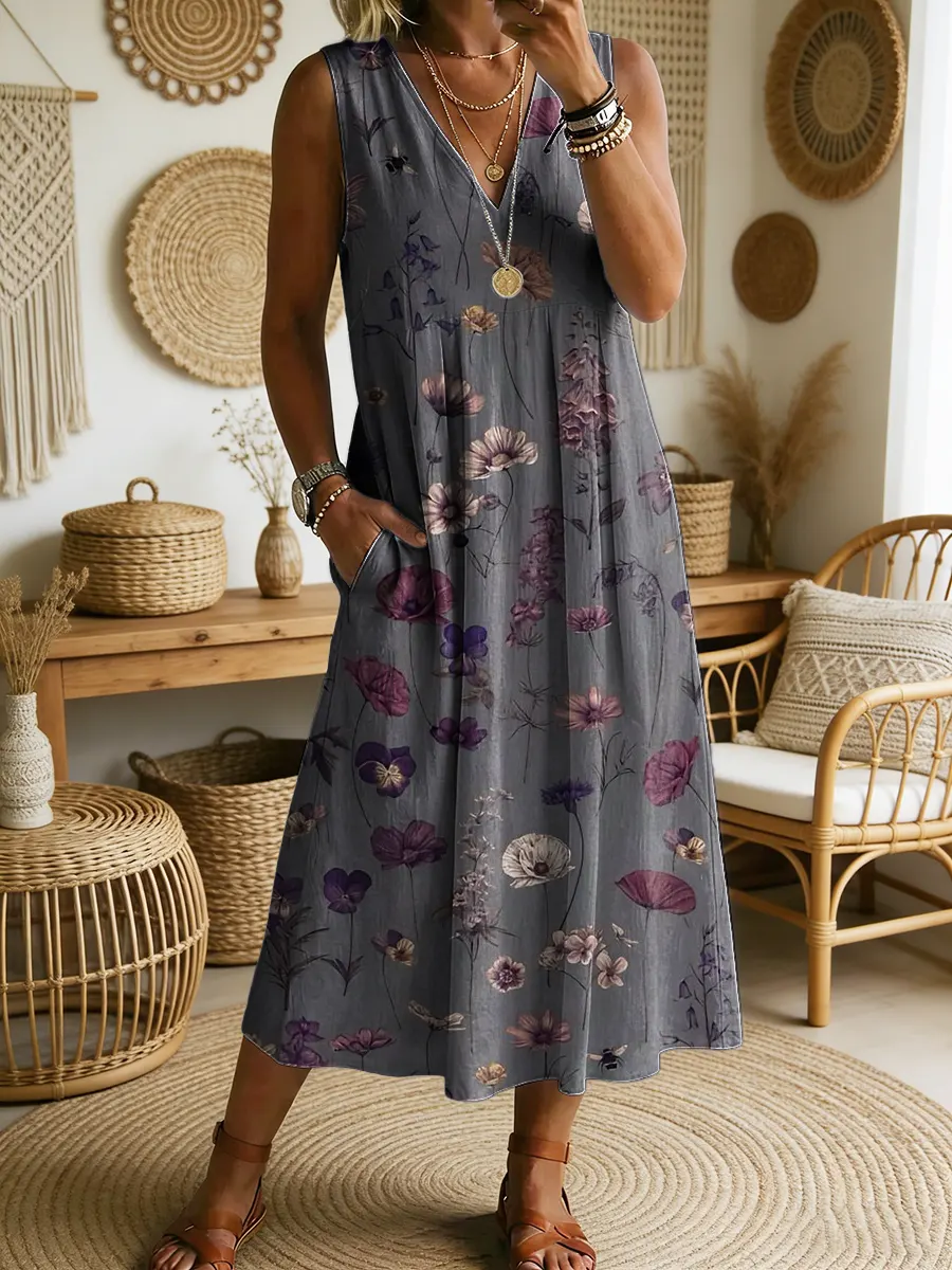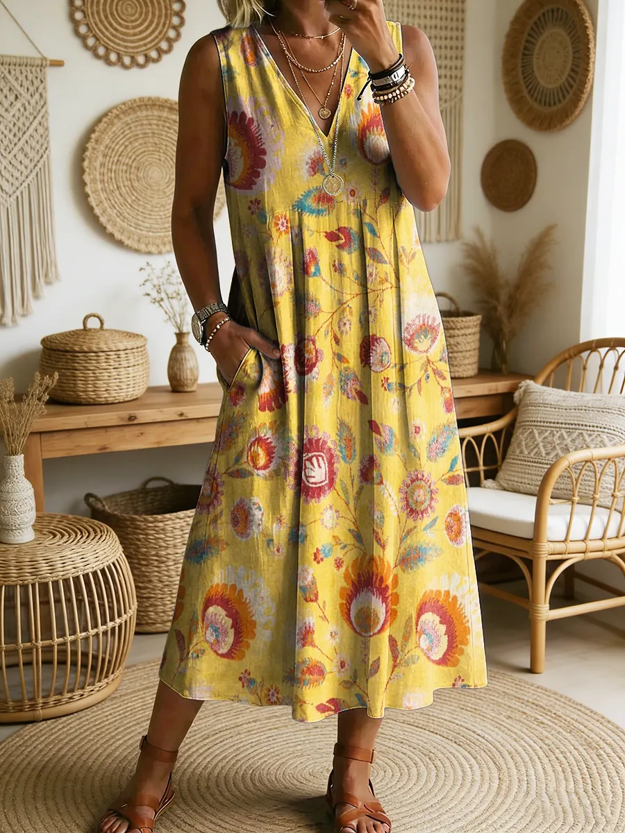 Women's Bohemian Floral Art Print V-Neck Sleeveless Cotton Pocket Dress