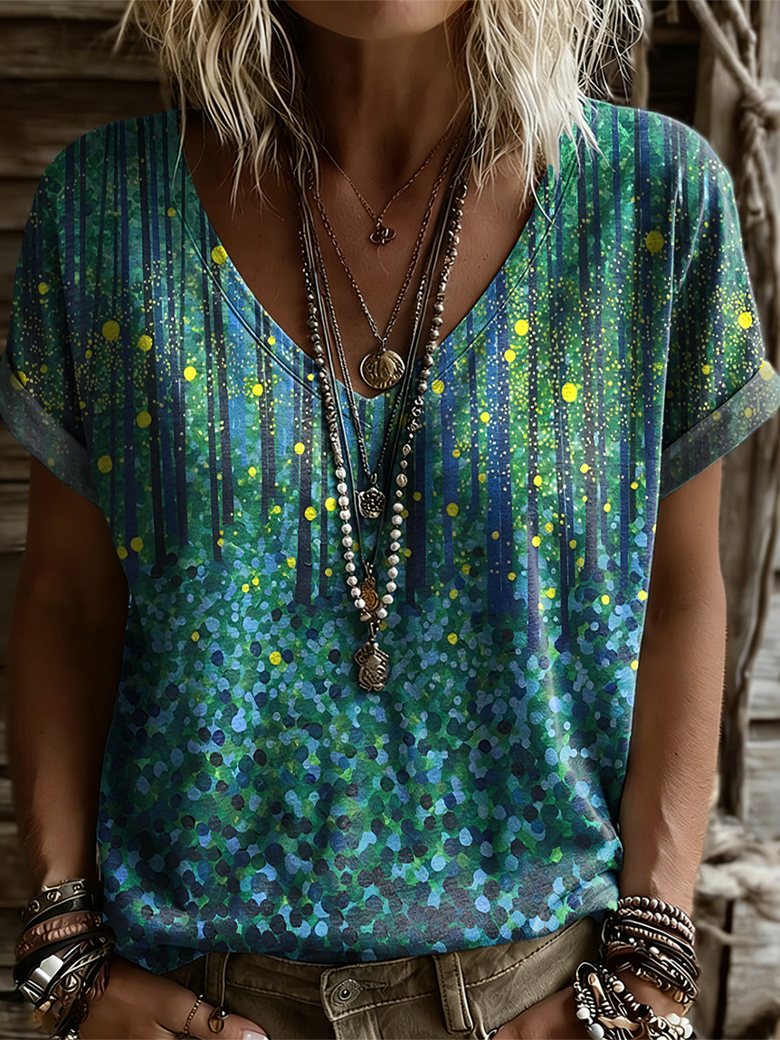 Women's Retro Colorful Art Print Casual Short-sleeve V-neck T-shirt