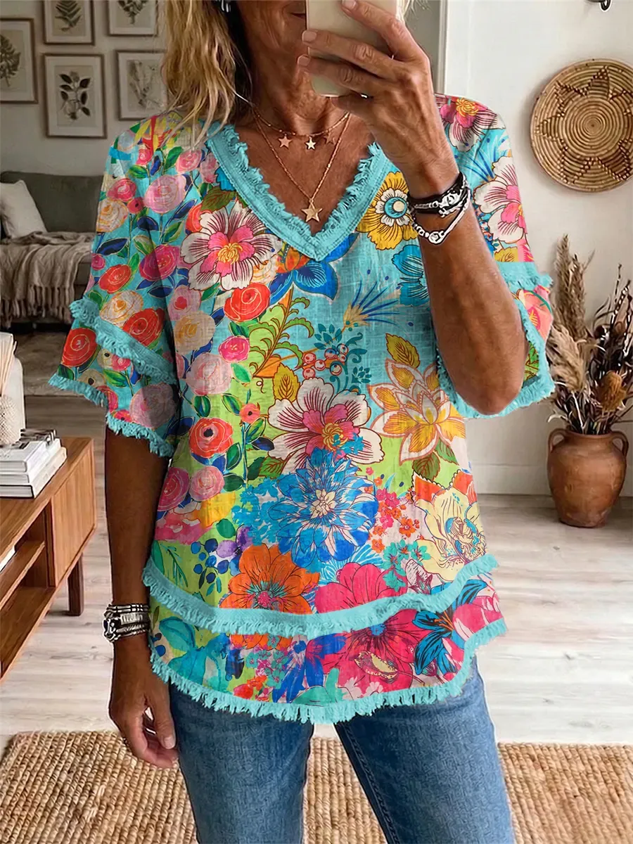 Bohemia Colorful Flowers Women's Art Casual Patchwork V Collar Shirt