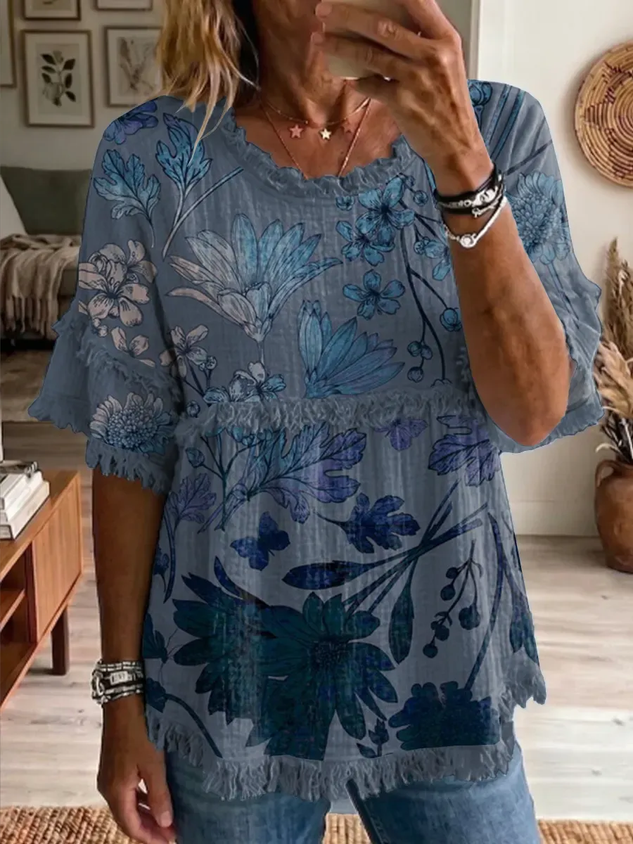 Ethnic Flower Women's Art Casual Round Neck Linen T-shirt