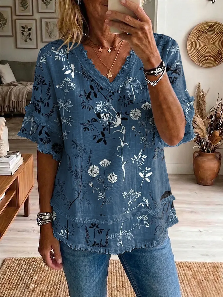 Ethnicity Flowers Texture Women's Art Casual Patchwork V Collar Shirt