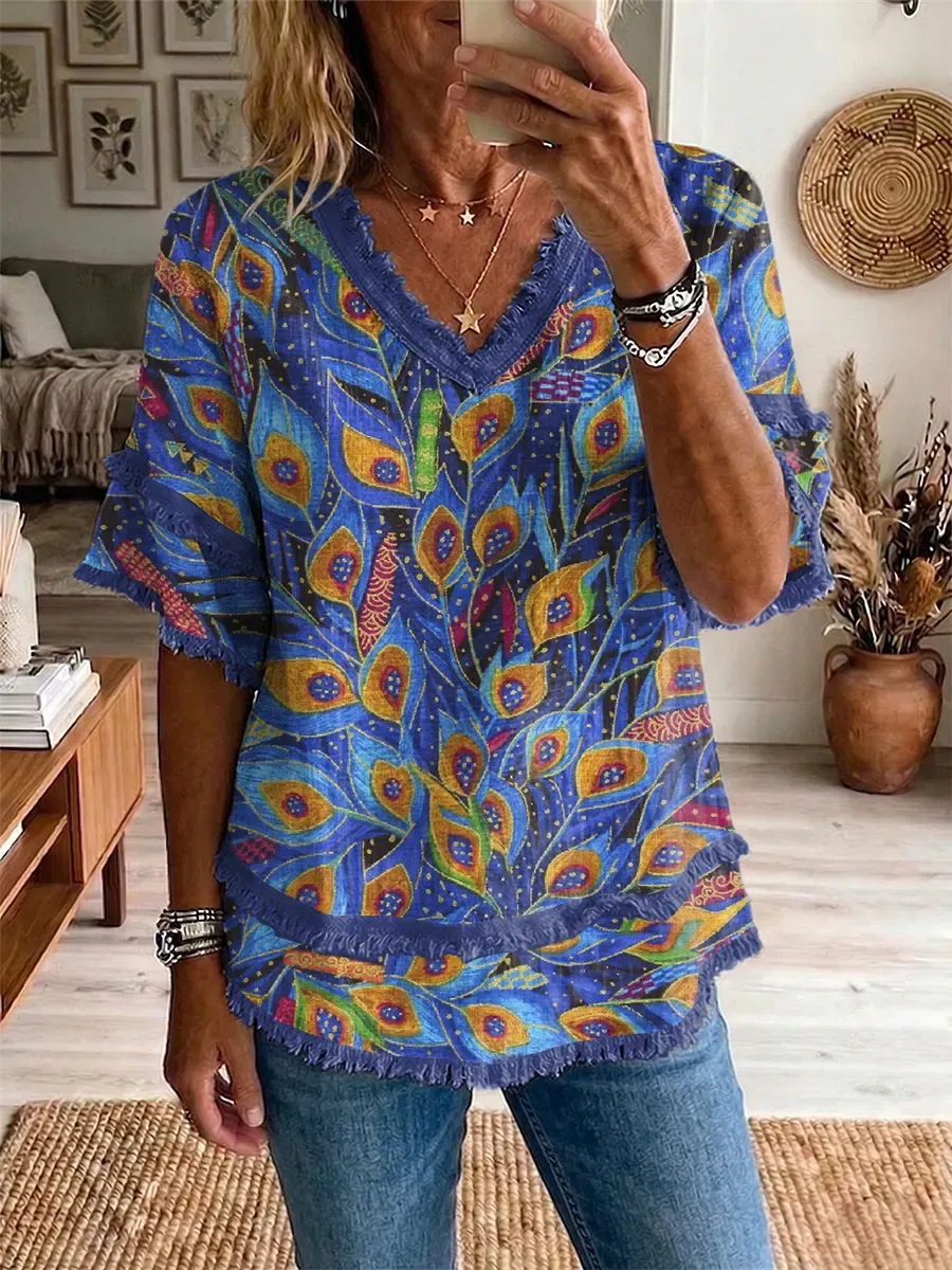 Ethnicity Geometry Feathers Women's Art Casual Patchwork V Collar Shirt
