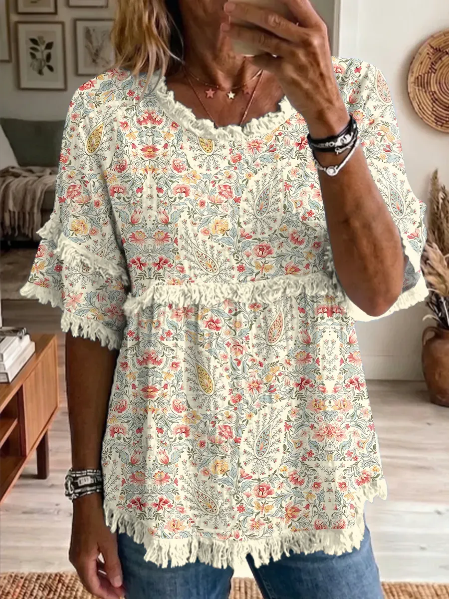 Ethnicity Paisley Pattern Women's Art Casual Round Neck Linen T-shirt