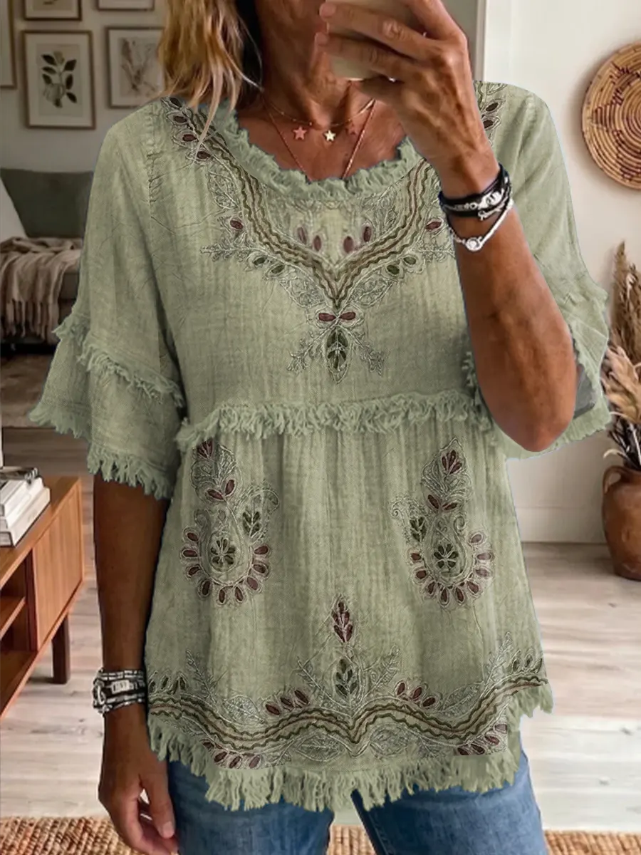 Ethnicity Texture Flowers Women's Art Casual Round Neck Linen T-shirt