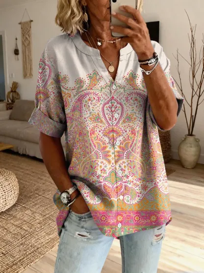 Women's Bohemian Ethnic Floral Art Print Casual Cotton-Linen Shirt