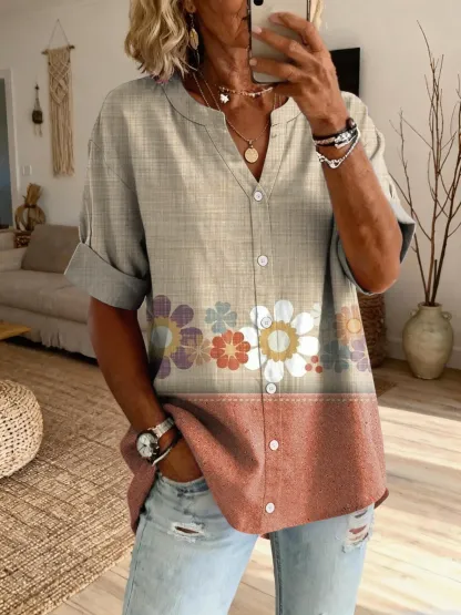 Women's Bohemian Floral Art Print Casual Cotton-Linen Shirt