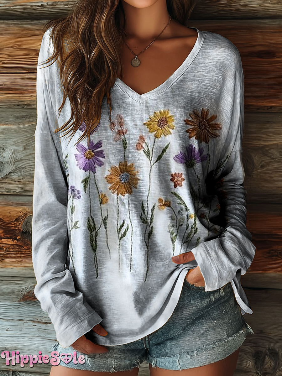 Women's Bohemian Floral Art Print Casual V-neck Long Sleeve T-shirt