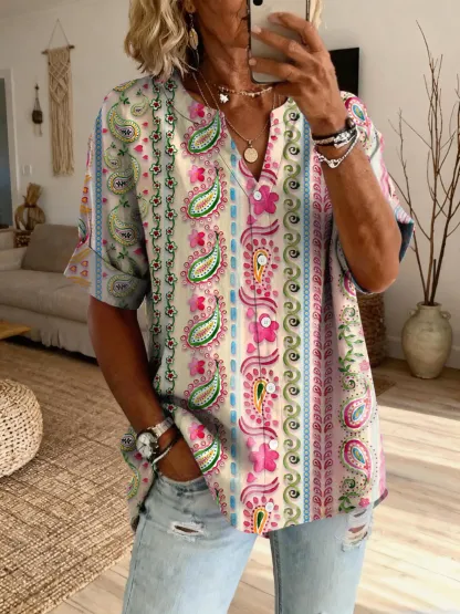 Women's Bohemian Striped Paisley Floral Art Print Casual Cotton-Linen Shirt