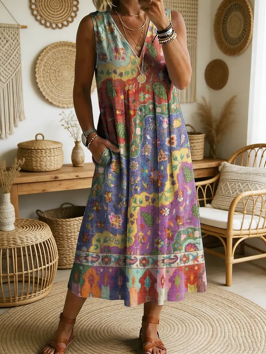 Women's Ethnic Floral Wave Patchwork Art Print V-Neck Lace Trim Cotton Pocket Dress