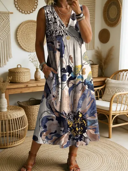 Women's Floral Art Print V-Neck Sleeveless Cotton Pocket Dress